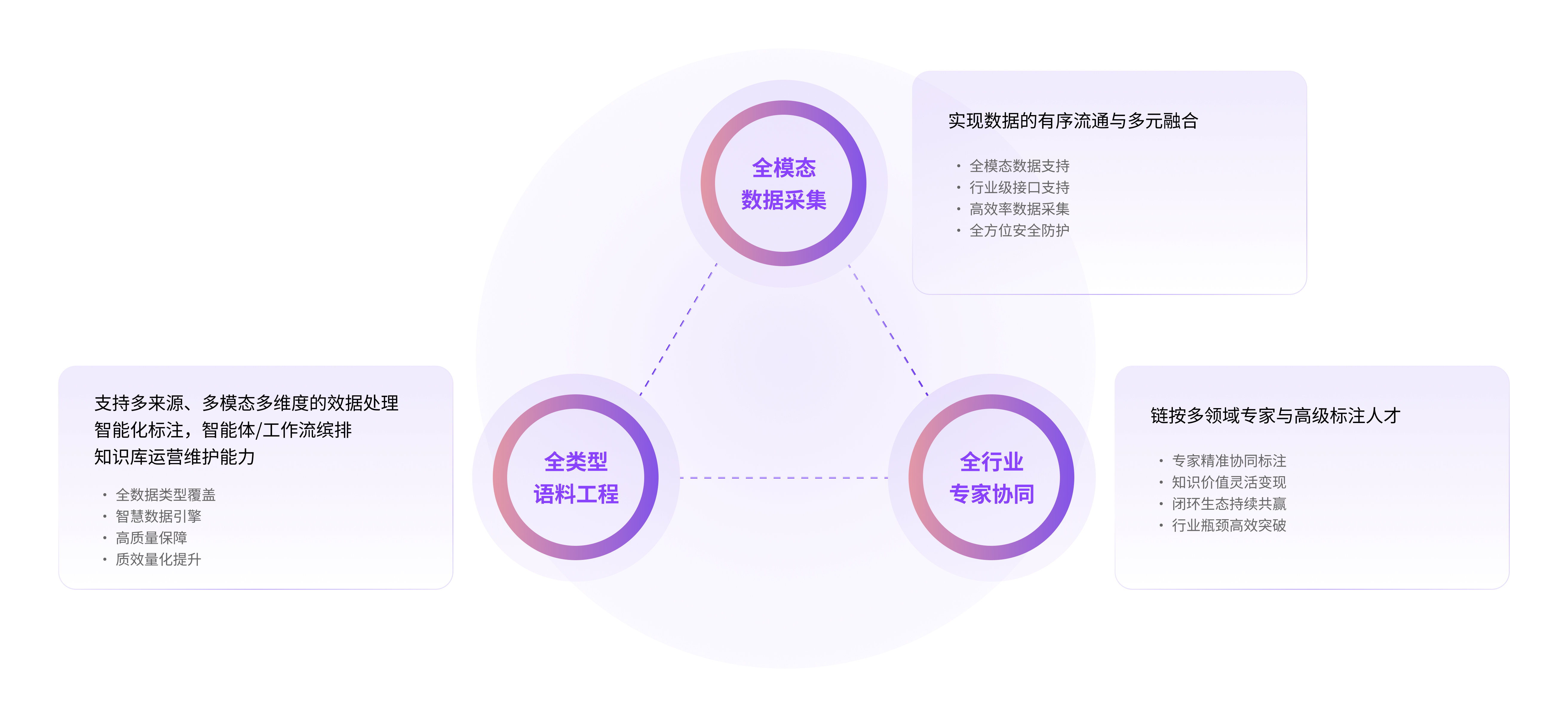 A full-modal data collection platform, an all-category corpus engineering platform, and a cross-industry expert collaboration platform. The synergy of these three platforms builds a new generation of AI data infrastructure, enabling the flow and integration of data, intelligent processing, and the maximization of knowledge value.Q